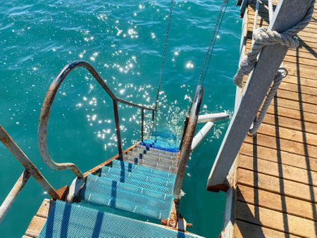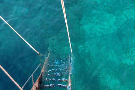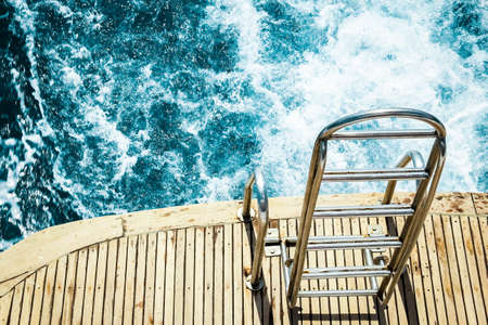 Boat Metal shiny staircase ocean on blue sea water background. Traveling destinations Red Sea vacation tourism shore summe.