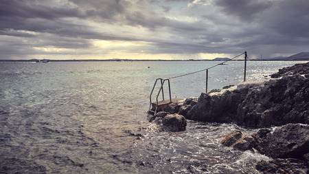 Path ended with sea ladder at sunset, color toning applied, Mallorca, Spain.
