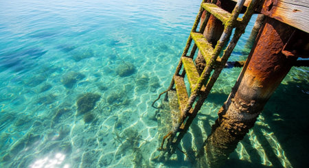 old and rusty ladder descending from the wooden pier to the sea