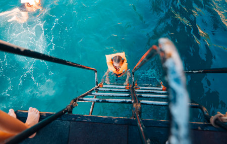 Experience the invigorating thrill of a refreshing summer swim from the boat ladders edge