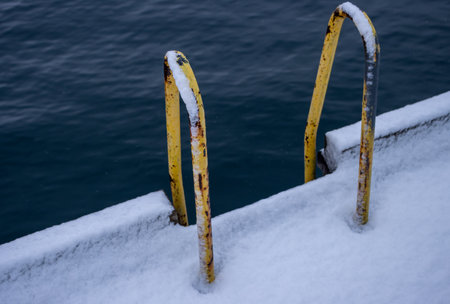 Diagonal view on the pier covered by fresh snow and water of Norvegian sea. Yellow old weathered railing of the steps to the sea. Narvik, Norway.