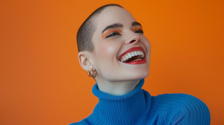 Vivid Expression: Joyful Woman with Glitter Makeup Laughing on Orange Background