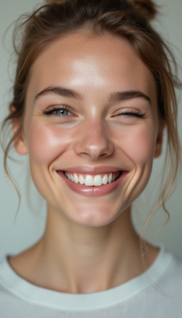A cheerful young woman with glowing skin and a playful wink radiates happiness and confidence. Her bright smile and sparkling eyes create an inviting atmosphere, showcasing the beauty of joy and self-assurance.