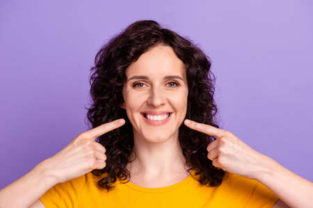 Photo of young attractive girl inidcate figners teeth cavity protection dentistry isolated over violet color background