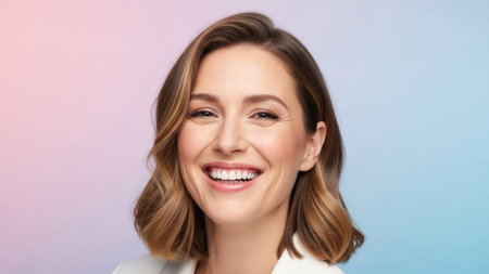 This portrait features a woman smiling. The subject's expression conveys happiness, emphasized by her eyes. The image utilizes soft lighting and a gradient background, enhancing the focus on the subject. Suitable for a range of uses, this image could be employed in various commercial and editorial contexts.