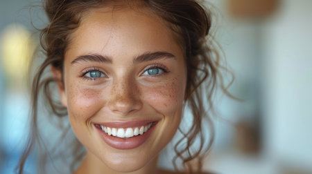 This image features a close-up portrait of a young woman smiling. The woman has fair skin and bright eyes, captured in natural lighting. The composition highlights her facial features. This image could be used for various commercial or editorial purposes, potentially related to beauty, health, or lifestyle themes.
