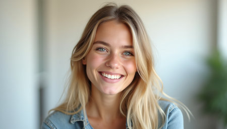 A cheerful young woman with stunning blue eyes and wavy blonde hair beams with a radiant smile against a soft blue background. Her joyful expression exudes warmth and positivity, inviting viewers to share in her happiness.