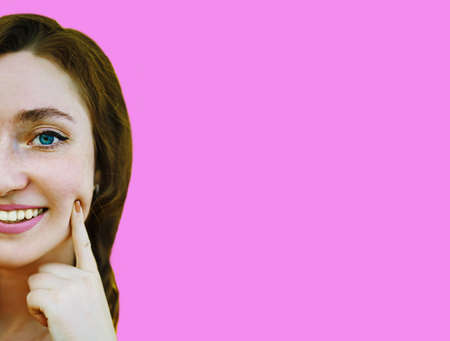 Beautiful woman with healthy skin and white teeth, young model with beautiful teeth smile against pink background.