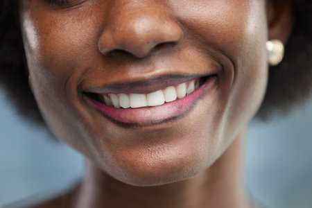 Crop close up portrait half face of woman with beaming smile while being at the dentist