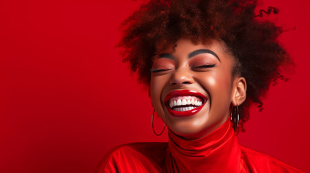 Black woman smiling and staring at camera while wearing red suit against red background. GENERATE AI