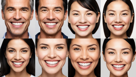 A composite image showcases a grid of diverse individuals, all smiling broadly. The portraits reveal a range of ages, ethnicities, and genders. The lighting appears soft and even, highlighting the expressions. The images could be used for various commercial purposes, such as illustrating positivity or representing a community.