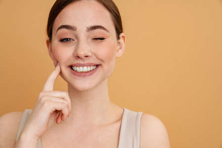 Photo of pretty joyful woman smiling and pointing at her cheeks isolated over beige background