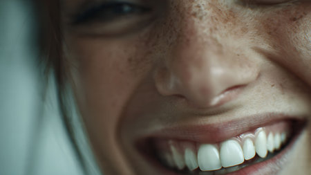 A close-up of a woman's smile, with white, straight teeth and full lips, exuding confidence and warmth in a candid moment.