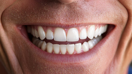 Close-up of a person's mouth with a radiant smile and sparkling white teeth, emphasizing the healthy and well-maintained appearance.