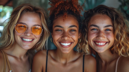Close-up image showcasing three young women from different ethnic backgrounds sharing a light-hearted moment. Their genuine smiles and casual summer outfits enhance the feeling of joy and friendship.