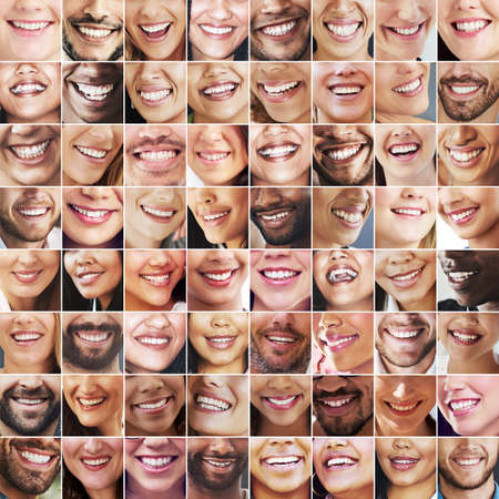 A mosaic of individuals of various ages and ethnicities display genuine smiles and laughter. The image showcases faces with bright smiles, revealing teeth, and joyful expressions. The lighting is even, highlighting skin tones. This composition has potential applications in marketing, advertising, and editorial content.