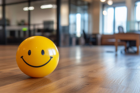 Smiling yellow ball in modern office promoting positivity and inspiring a happy work culture