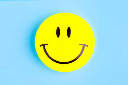 Yellow emoticon with funny eyes on bright blue background. Good day wishes. Copy space for your text