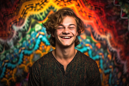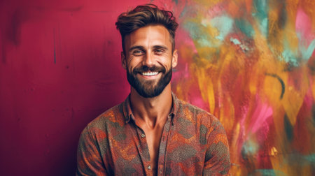 Vibrant portrait of a smiling man in colorful outfit against abstract background