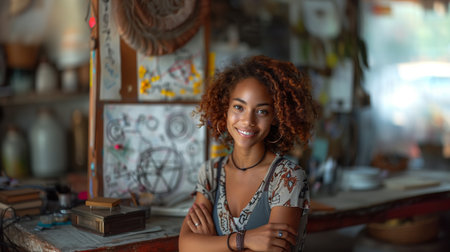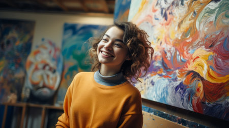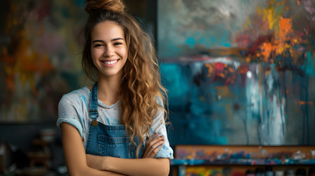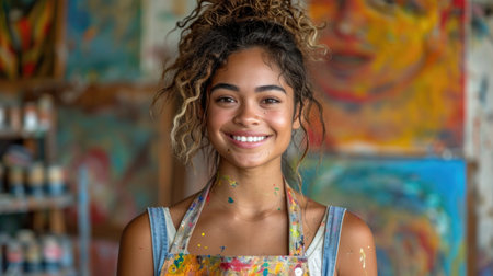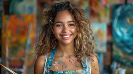 Smiling young mixed-race woman painter with curly hair next to her artwork in an art studio. Concept of artistic talent, fine arts, creative process, oil painting, and cultural diversity.