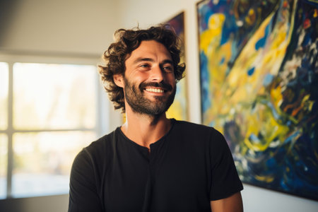 Young Man Smiling at an Art Gallery Exhibition. High quality photo