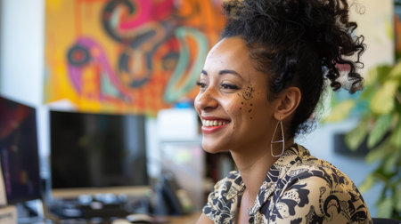 Joyful art teacher in a creative classroom, embodying artistic education and inspiration.
