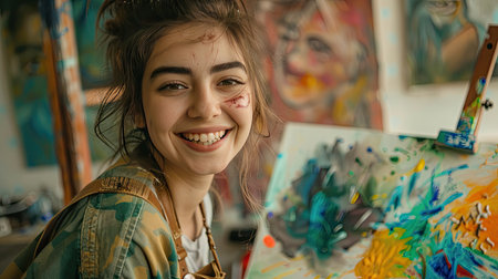 A joyful young girl smiling as she paints, surrounded by vibrant colors and creative energy, perfect for artistic themes.