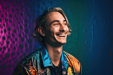 Happy young man smiling. Colorful gen z male portrait, positive mindset concept. Generative AI