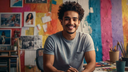 Smiling Young Artist with Brush Against Vibrant Artistic Background.