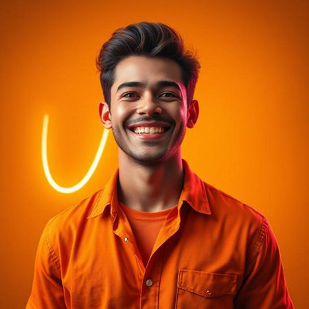 A man is smiling broadly, illuminated by a gradient background of orange and yellow hues. He is wearing a blue shirt. The image conveys positivity and happiness, suitable for various commercial purposes. The studio lighting enhances the bright colors and composition.