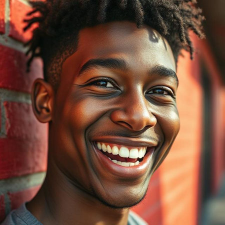 Close up portrait of a smiling young African American man against brick wall
