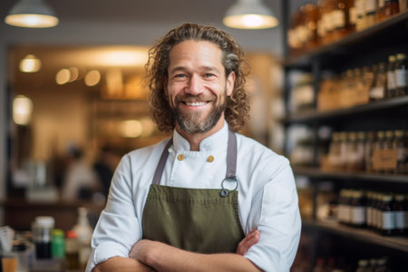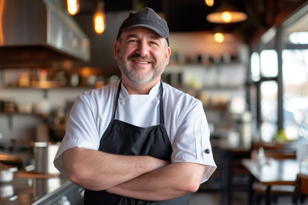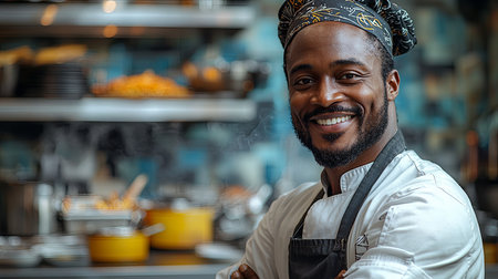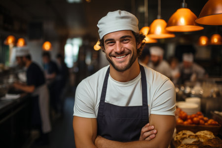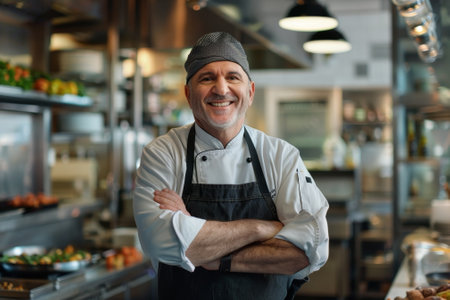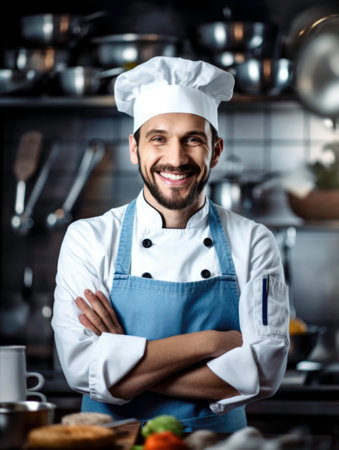 Confident and skilled chef stands proudly in a professional kitchen environment, exuding expertise and passion for culinary arts, with his arms crossed and a genuine smile