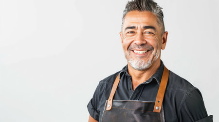 Middle-aged Latin man in an apron, smiling and posing for the camera, with a white background, ideal for kitchen and culinary contexts