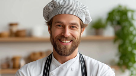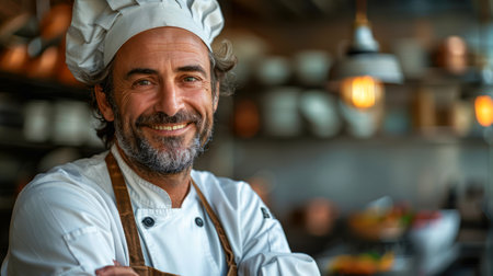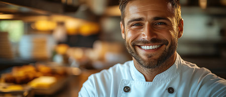 Smiling chef in white uniform, standing in a cozy, warmly lit kitchen