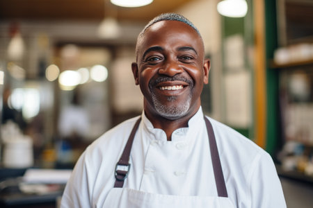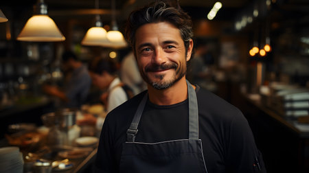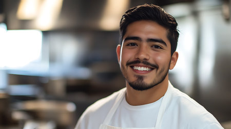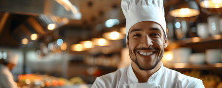 photo of a chef smiling at the camera, kitchen background with copy space.Generated by AI