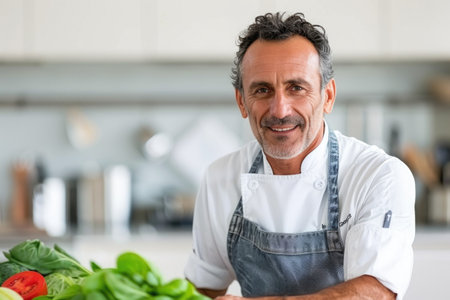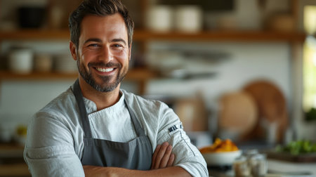 An AI illustration of A mature male adult stands in a modern kitchen with his arms crossed, smiling confidently at the camera