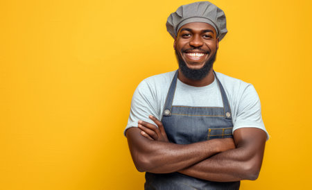 A cheerful young chef wearing a white uniform smiles confidently against a vibrant yellow background, embodying professionalism and passion for cooking.