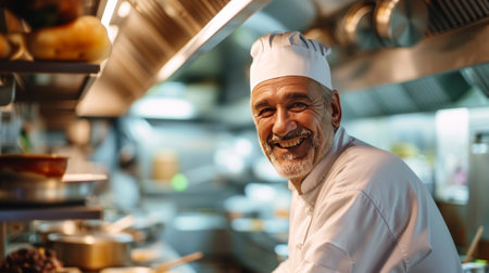 Portrait of a senior male chef in a restaurant kitchen smiling at the camera.