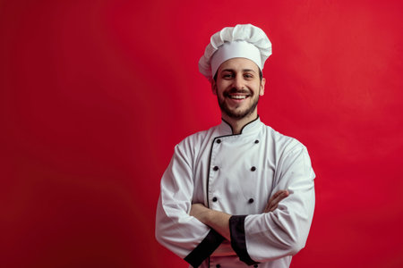 Professional chef man wearing a white uniform and toque standing with arms crossed, smiling happily and looking away, with copy space for advertising culinary concepts