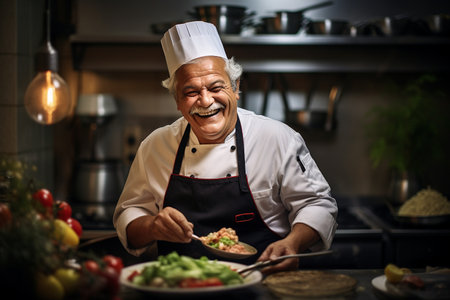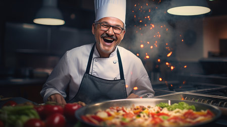 Exuberant Chef Demonstrates Culinary Mastery in Restaurant Kitchen. Concept Gourmet Food Presentation, Creative Cooking Techniques, Fine Dining Experience