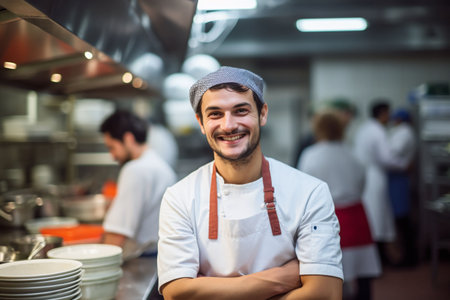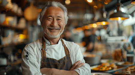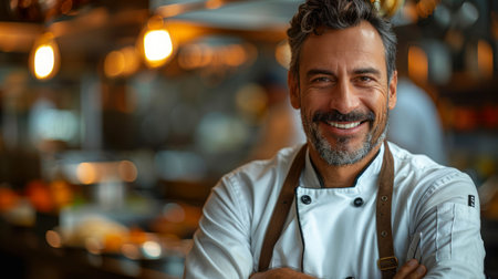 Experienced chef confidently poses in bustling kitchen, arms crossed, smiling at camera amidst restaurant's hustle