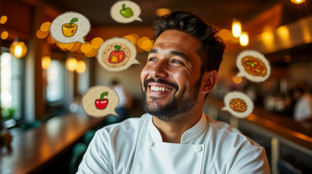 In a bustling restaurant, a chef expresses joy while surrounded by thought bubbles depicting fresh ingredients and vibrant dishes, emphasizing creativity and passion for cooking.