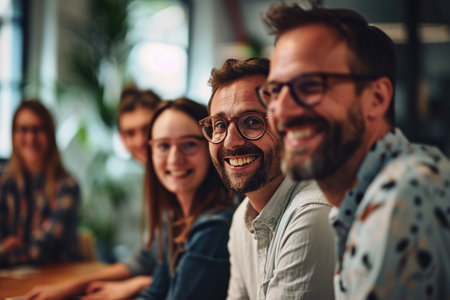 Group of diverse professionals share smiles and ideas in a vibrant office setting during a meeting.