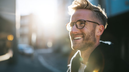 Smiling man with glasses stands outdoors, illuminated by sunlight, exuding sense of joy and warmth. background features blurred urban setting, enhancing cheerful atmosphere