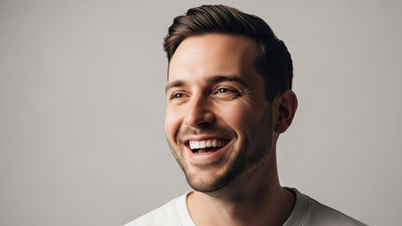 A close-up portrait showcases a smiling man with brown hair and a light beard. The lighting is soft and flattering, highlighting the facial features against a plain, neutral backdrop. This image could be used for various commercial or editorial purposes, such as articles or advertising.