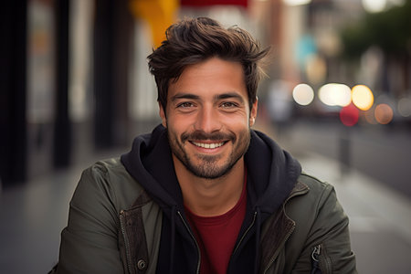 Portrait of cheerful bearded young man in casual jacket against blurred city background