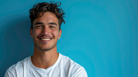 Fashionable young man with short dark hair against a bright blue background, smiling and looking directly at the camera, dressed in a white t-shirt