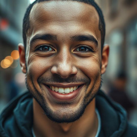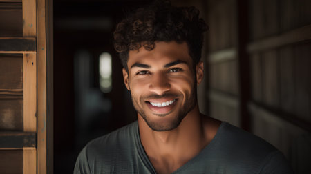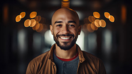 A close-up shot features a smiling man with a beard and short dark hair. The image displays warm tones with soft lighting. The composition highlights the man's expression, suggesting a positive mood. Suitable for various commercial uses, including advertising and editorial content.