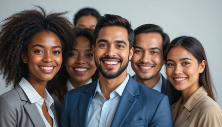 Proud and united, the members of a successful business team smile brightly in the office, conveying confidence as they face the camera.