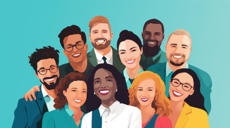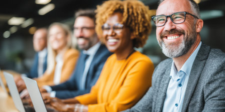 A diverse group of professionals, smiling and engaged, showcase teamwork and collaboration in a modern office. Their vibrant energy and unity reflect a productive work environment.